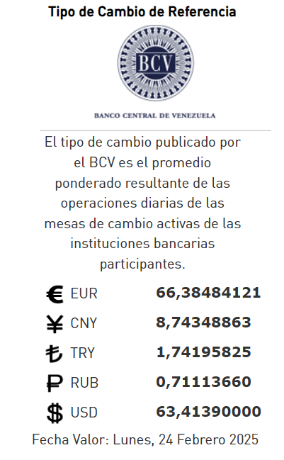 02-25.-El precio del dólar en el Banco Central de Venezuela (BCV) se cotizó este viernes 21 de febrero 2025 en Bs.63,41 por unidad según la última actualización en su página web oficial y redes sociales.