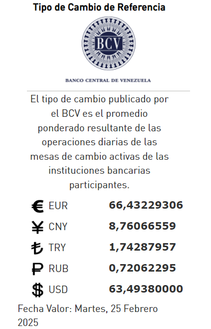 25-02-25.-El precio del dólar en el Banco Central de Venezuela (BCV) se cotizó este lunes 24 de febrero 2025 en Bs.63,49 por unidad según la última actualización en su página web oficial y redes sociales.