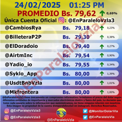 Por otro lado, el dólar paralelo en diversas plataformas en la jornada de hoy cerró en un promedio de Bs.79,62 la unidad, según Monitor-Noticias Venezuela.