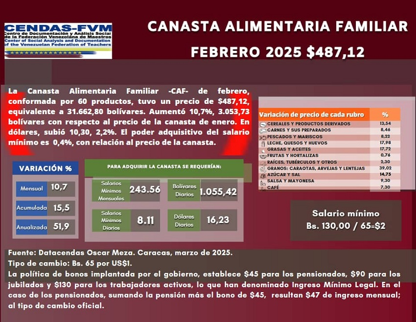 23-03-25.-El director del Centro de Documentación y Análisis Social de la Federación Venezolana de Maestros (Cendas-FVM), Óscar Meza, informó este 22 de marzo, que la Canasta Alimentaria Familiar en el mes de febrero de 2025, se ubicó en US$ 487,12, el equivalente a Bs. 31.662,80.
