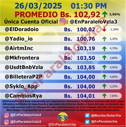 Por otro lado, el dólar paralelo en diversas plataformas en la jornada de hoy cerró en un promedio de Bs.102,92 la unidad, según Monitor-Noticias Venezuela.