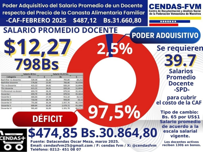 27-03-25.-El Centro de Documentación y Análisis Social de la Federación Venezolana de Maestros (Cendas-FVM) informó este miércoles que el salario promedio de un docente en febrero fue de USD 12,27 o lo que fue lo mismo, 798 bolívares.