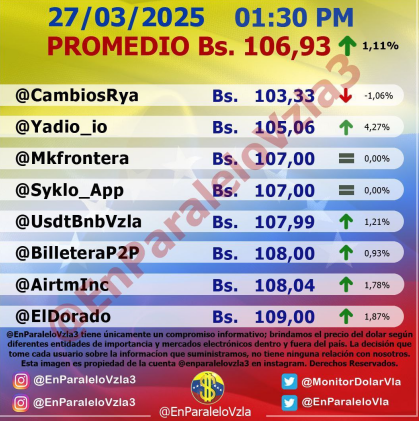 Por otro lado, el dólar paralelo en diversas plataformas en la jornada de hoy cerró en un promedio de Bs.106,93 la unidad, según Monitor-Noticias Venezuela.