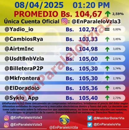 Por otro lado, el dólar paralelo en diversas plataformas en la jornada de hoy cerró en un promedio de Bs.104,67 la unidad, según Monitor-Noticias Venezuela.