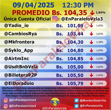 Por otro lado, el dólar paralelo en diversas plataformas en la jornada de hoy cerró en un promedio de Bs.104,35 la unidad, según Monitor-Noticias Venezuela.