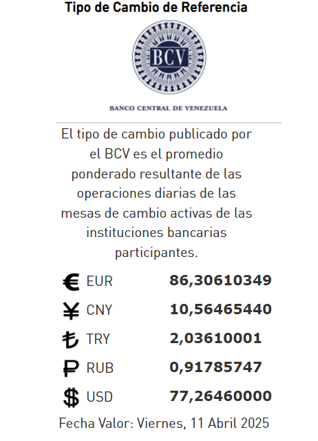 11-04-25.-El precio del dólar en el Banco Central de Venezuela (BCV) se cotizó este jueves 10 de abril 2025 en Bs.77,26 por unidad según la última actualización en su página web oficial y redes sociales.