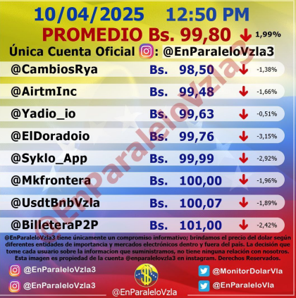Por otro lado, el dólar paralelo en diversas plataformas en la jornada de hoy cerró en un promedio de Bs.99,80 la unidad, según Monitor-Noticias Venezuela.