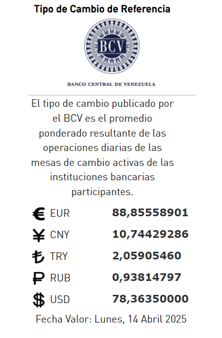 12-04-25.-El precio del dólar en el Banco Central de Venezuela (BCV) se cotizó este de abril 2025 en Bs.78,36 por unidad según la última actualización en su página web oficial y redes sociales.