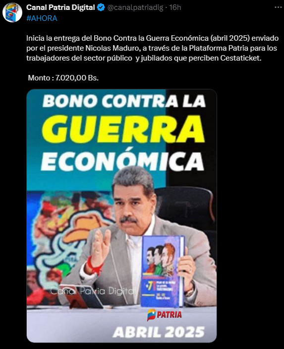 De acuerdo con el Canal Patria Digital en X se informó que el monto a otorgar es de Bs. 7.020,00 o US$ 89,62 al tipo de cambio vigente del Banco Central de Venezuela (BCV).