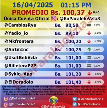 Por otro lado, el dólar paralelo en diversas plataformas en la jornada de hoy cerró en un promedio de Bs.100,37 la unidad, según Monitor-Noticias Venezuela.