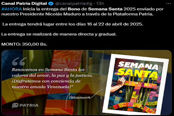 Desde ayer miércoles 16 de abril comenzó la asignación del bono "Semana Santa", a través de la Plataforma Patria Digital, enviado por el presidente de la República, Nicolás Maduro.