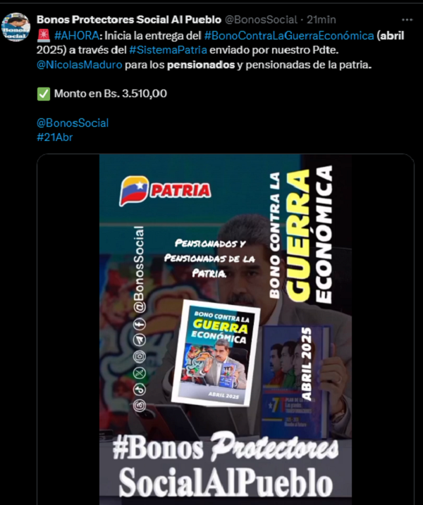 El día de hoy 21 de abril del presente año, a través de la cuenta Telegram "Bonos Sociales Protectores del Pueblo" se informó quecomenzó la adjudicación del "Bono Contra La Guerra Económica" dirigido a los pensionados del IVSS.