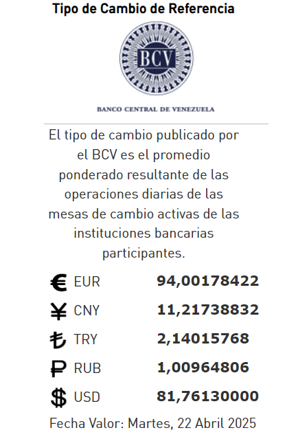 22-04-25.-El precio del dólar en el Banco Central de Venezuela (BCV) se cotizó este lunes 21 de abril 2025 en Bs.81,76 por unidad según la última actualización en su página web oficial y redes sociales.