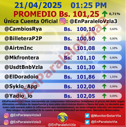 Por otro lado, el dólar paralelo en diversas plataformas en la jornada de hoy cerró en un promedio de Bs.101,25 la unidad, según Monitor-Noticias Venezuela.