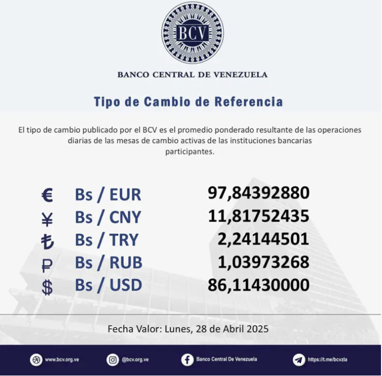 29-04-25.-El precio del dólar en el Banco Central de Venezuela (BCV) se cotizó este lunes 28 de abril 2025 en Bs. 86,65 por unidad según la última actualización en su página web oficial y redes sociales.