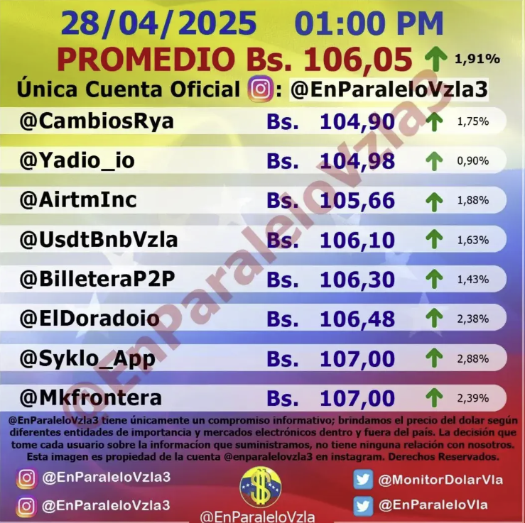 Por otro lado, el dólar paralelo en diversas plataformas en la jornada de hoy cerró en un promedio de Bs. 106,05 la unidad, según Monitor-Noticias Venezuela.