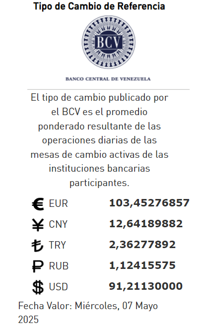 07-05-25.-El precio del dólar en el Banco Central de Venezuela (BCV) se cotizó este martes 06 de mayo 2025 en Bs. 91,21 por unidad según la última actualización en su página web oficial y redes sociales.