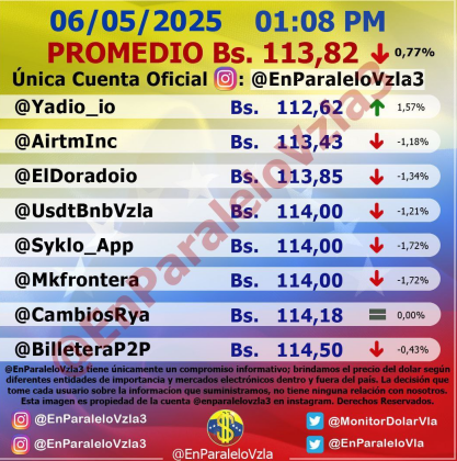 Por otro lado, el dólar paralelo en diversas plataformas en la jornada de hoy cerró en un promedio de Bs. 113,82 la unidad, según Monitor-Noticias Venezuela.
