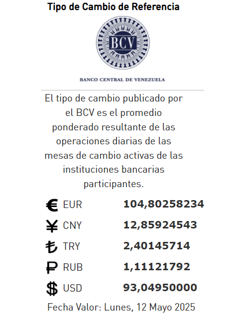 10-05-25.-El precio del dólar en el Banco Central de Venezuela (BCV) se cotizó este viernes 09 de mayo 2025 en Bs. 93,04 por unidad según la última actualización en su página web oficial y redes sociales.