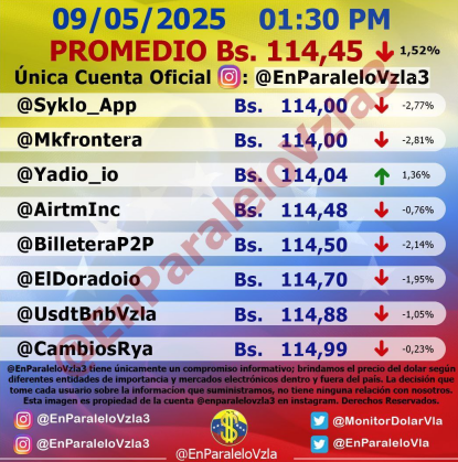 Por otro lado, el dólar paralelo en diversas plataformas en la jornada de hoy cerró en un promedio de Bs. 114,45 la unidad, según Monitor-Noticias Venezuela.