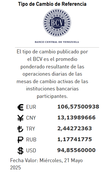 05-25.-El precio del dólar en el Banco Central de Venezuela (BCV) se cotizó este martes 20 de mayo 2025 en Bs.94,85 por unidad según la última actualización en su página web oficial y redes sociales.
