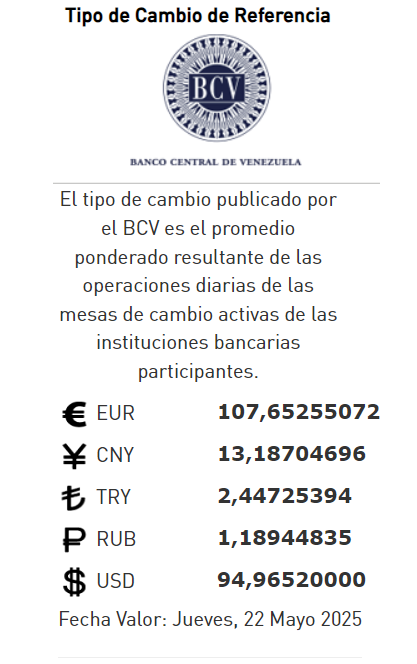 22-05-25.-El precio del dólar en el Banco Central de Venezuela (BCV) se cotizó este miércoles 21 de mayo 2025 en Bs.94,96 por unidad según la última actualización en su página web oficial y redes sociales.