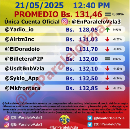 Por otro lado, el dólar paralelo en diversas plataformas en la jornada de hoy cerró en un promedio de Bs.131,46 la unidad, según Monitor-Noticias Venezuela.