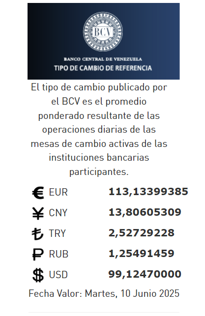 10-06-25.-El precio del dólar en el Banco Central de Venezuela (BCV) se cotizó este lunes 09 de junio 2025 en Bs.99.12 por unidad según la última actualización en su página web oficial y redes sociales.