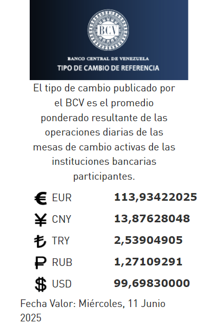 11-06-25.-El precio del dólar en el Banco Central de Venezuela (BCV) se cotizó este martes 10 de junio 2025 en Bs.99,69 por unidad según la última actualización en su página web oficial y redes sociales.