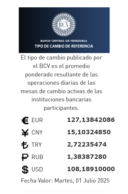 01-07-25.-El precio del dólar en el Banco Central de Venezuela (BCV) se cotizó este 30 de junio 2025 en Bs.108.18 por unidad según la última actualización en su página web oficial y redes sociales.