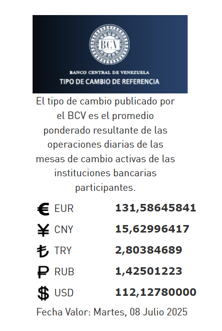 08-07-25.-El precio del dólar en el Banco Central de Venezuela (BCV) se cotizó este lunes 07 de julio 2025 en Bs.112,13 por unidad según la última actualización en su página web oficial y redes sociales.