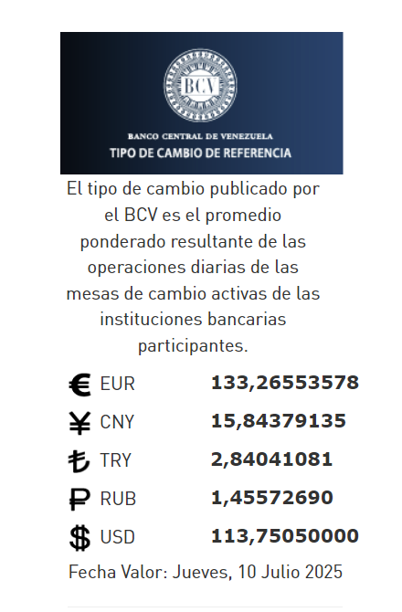 10-07-25.-El precio del dólar en el Banco Central de Venezuela (BCV) se cotizó este miércoles 09 de julio 2025 en Bs.113,75 por unidad según la última actualización en su página web oficial y redes sociales.