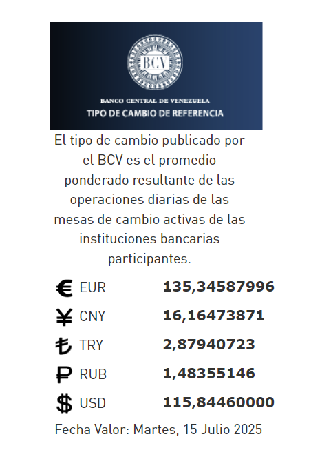 15-07-25.-El precio del dólar en el Banco Central de Venezuela (BCV) se cotizó este lunes 14 de julio 2025 en Bs.115,84 por unidad según la última actualización en su página web oficial y redes sociales.