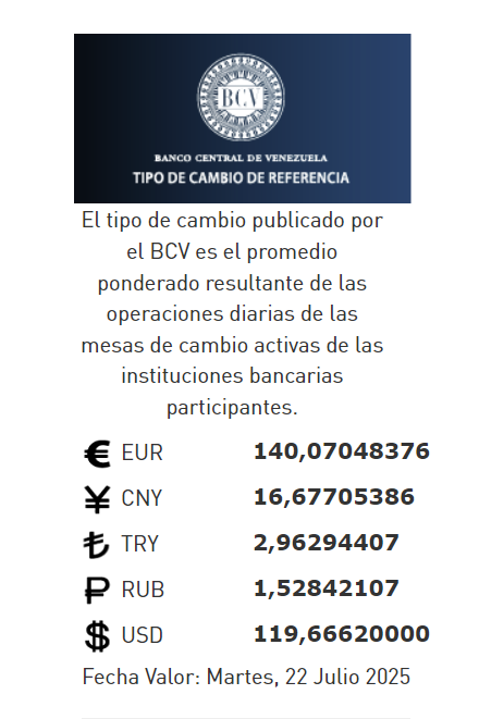 22-07-25.-El precio del dólar en el Banco Central de Venezuela (BCV) se cotizó este lunes 21 de julio 2025 en Bs.119,66 por unidad según la última actualización en su página web oficial y redes sociales. /
