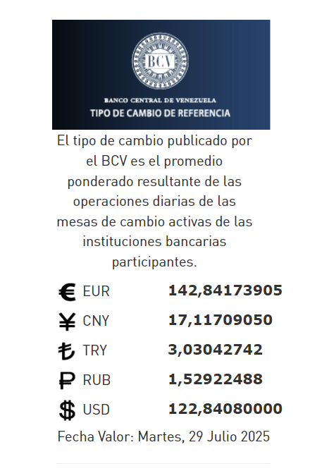 07-25.-El precio del dólar en el Banco Central de Venezuela (BCV) se cotizó este lunes 28 de julio 2025 en Bs.122,84 por unidad según la última actualización en su página web oficial y redes sociales.