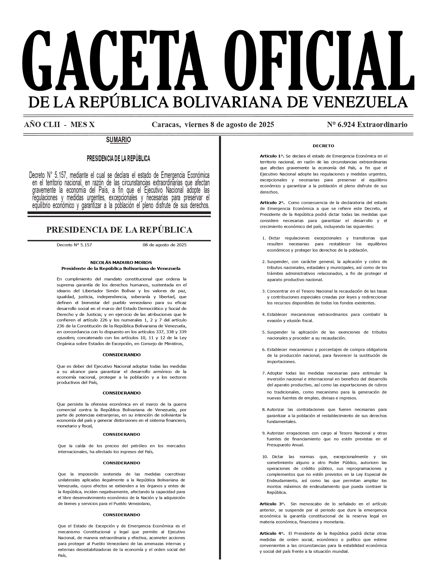 En la renovación de este decreto de emergencia, publicada en la Gaceta Oficial Extraordinario 6.924, el Ejecutivo considera que persiste «la ofensiva económica en el marco de la guerra comercial contra la República Bolivariana de Venezuela, por parte de potencias extranjeras, en su intención de soliviantar la economía del país y generar distorsiones en el sistema financiero, monetario y fiscal».