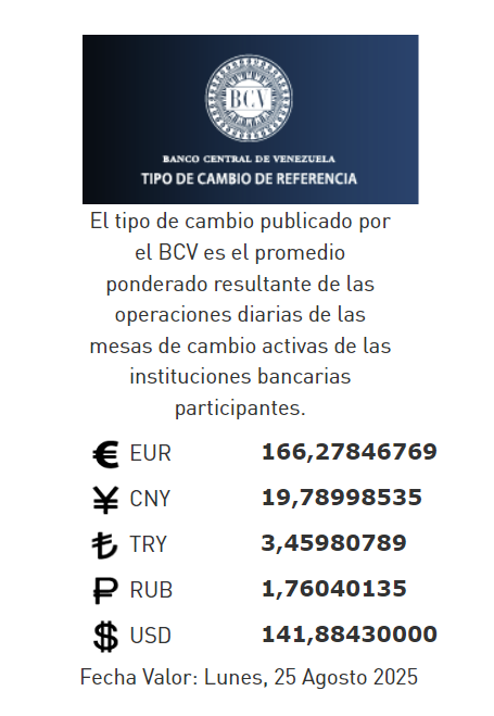 08-25.-El precio del dólar en el Banco Central de Venezuela (BCV) se cotizó este viernes 22 de agosto 2025 en Bs.141,87 por unidad según la última actualización en su página web oficial y redes sociales.