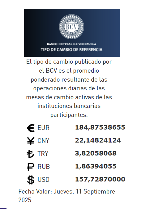 11-09-25.-El precio del dólar en el Banco Central de Venezuela (BCV) se cotizó este miércoles 10 de septiembre 2025 en Bs.157,72 por unidad según la última actualización en su página web oficial y redes sociales.