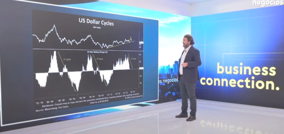 El dólar estadounidense podría estar entrando en su tercer ciclo bajista histórico. Este tercer ciclo indicaría un debilitamiento prolongado de la moneda, similar a los ciclos previos tras crisis petroleras y la crisis financiera de 2008. La ruptura de niveles de soporte de largo plazo podría suponer el “ocaso del dólar” como activo refugio y moneda hegemónica global.