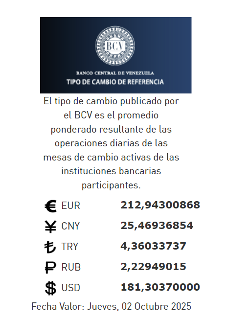 02-10-25.-El precio del dólar en el Banco Central de Venezuela (BCV) se cotizó este miércoles 01 de octibre 2025 en Bs.181,30 por unidad según la última actualización en su página web oficial y redes sociales.