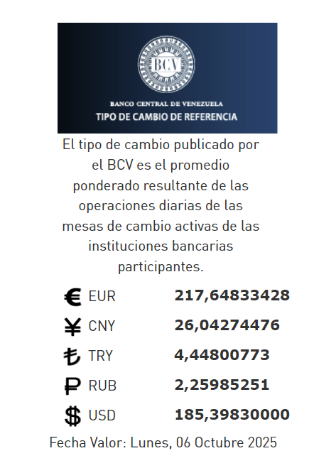 04-10-25.-El precio del dólar en el Banco Central de Venezuela (BCV) se cotizó este viernes 03 de octubre 2025 en Bs.185,39 por unidad según la última actualización en su página web oficial y redes sociales.