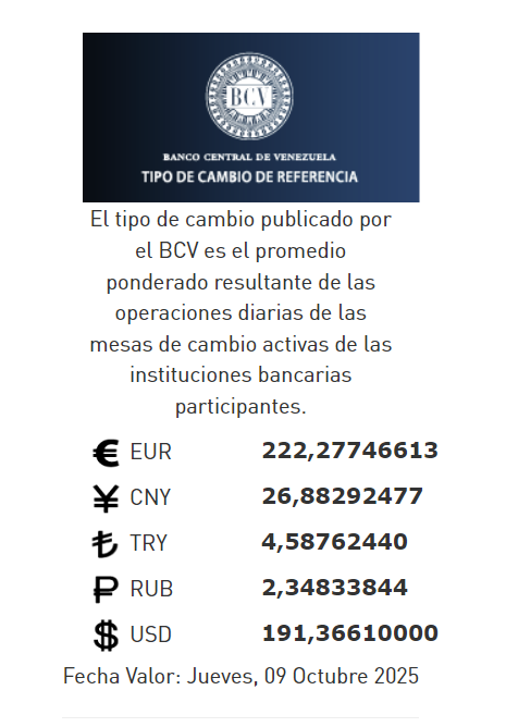 09-10-25.-El precio del dólar en el Banco Central de Venezuela (BCV) se cotizó este miércoles 08 de octubre 2025 en Bs.191,36 por unidad según la última actualización en su página web oficial y redes sociales.