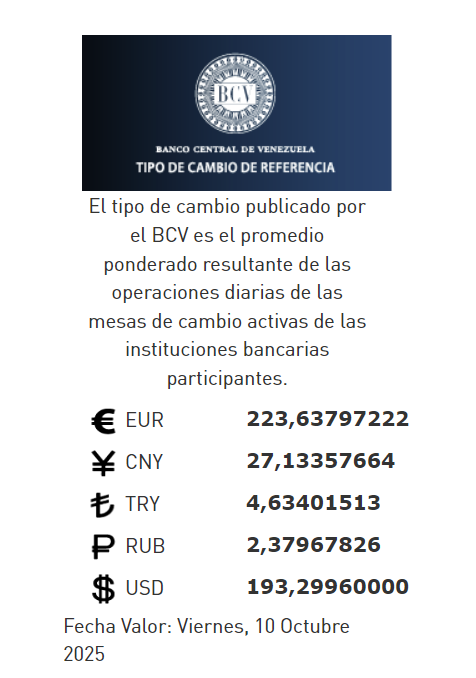 10-10-25.-El precio del dólar en el Banco Central de Venezuela (BCV) se cotizó este jueves 09 de octubre 2025 en Bs.193,29 por unidad según la última actualización en su página web oficial y redes sociales.