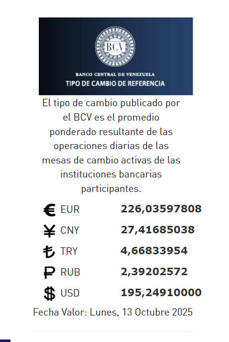 11-10-25.-El precio del dólar en el Banco Central de Venezuela (BCV) se cotizó este viernes 10 de octubre 2025 en Bs.195,24 por unidad según la última actualización en su página web oficial y redes sociales.