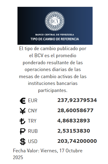 17-10-25.-El precio del dólar en el Banco Central de Venezuela (BCV) se cotizó este jueves 16 de octubre 2025 en Bs.203,74 por unidad según la última actualización en su página web oficial y redes sociales.