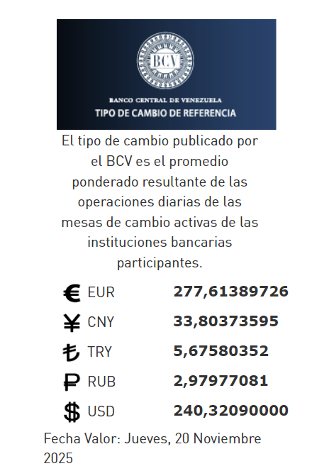 20-11-25.-El precio del dólar en el Banco Central de Venezuela (BCV) se cotizó este miércvoles 19 de noviembre 2025 en Bs.240,32 por unidad según la última actualización en su página web oficial y redes sociales.