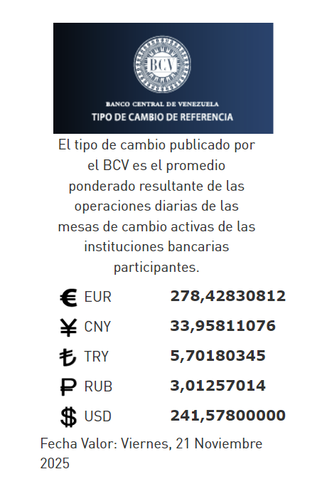 21-11-25.-El precio del dólar en el Banco Central de Venezuela (BCV) se cotizó este jueves 20 de noviembre 2025 en Bs.241,57 por unidad según la última actualización en su página web oficial y redes sociales.