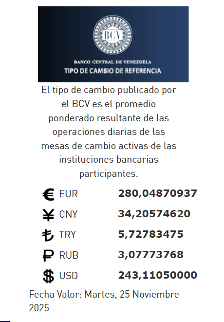 22-11-25.-El precio del dólar en el Banco Central de Venezuela (BCV) se cotizó este viernes 22 de noviembre 2025 en Bs.243,11 por unidad según la última actualización en su página web oficial y redes sociales.