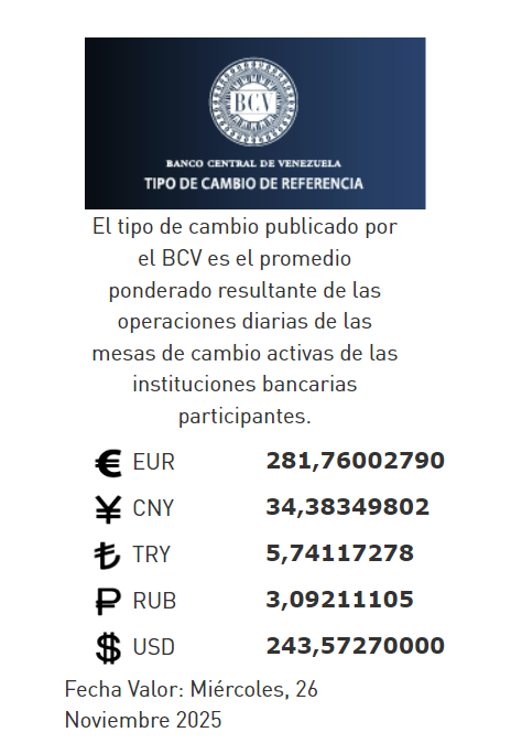 26-11-25.-El precio del dólar en el Banco Central de Venezuela (BCV) se cotizó este martes 25 de noviembre 2025 en Bs.243,57 por unidad según la última actualización en su página web oficial y redes sociales.
