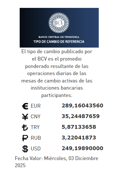 03-12-25.-El precio del dólar en el Banco Central de Venezuela (BCV) se cotizó este martes 02 de diciembre 2025 en Bs.249,19 por unidad según la última actualización en su página web oficial y redes sociales.